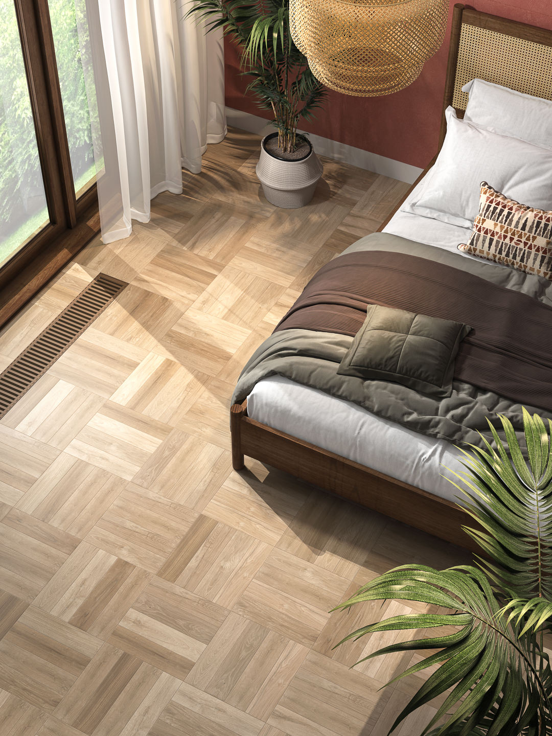 Спокойная графика среза аргании представлена в четырёх цветовых решениях, различающихся по глубине тона: два варианта в золотисто-коричневой гамме и два – в бежево-серой. Формат небольшой доски расширяет творческий потенциал материала: благодаря возможности экспериментировать с паркетными раскладками этот керамогранит особенно хорошо подходит для отделки пола. Приятные глазу оттенки и плавные линии среза будут выглядеть органично как в интерьере жилой зоны, так и в коммерческом пространстве.