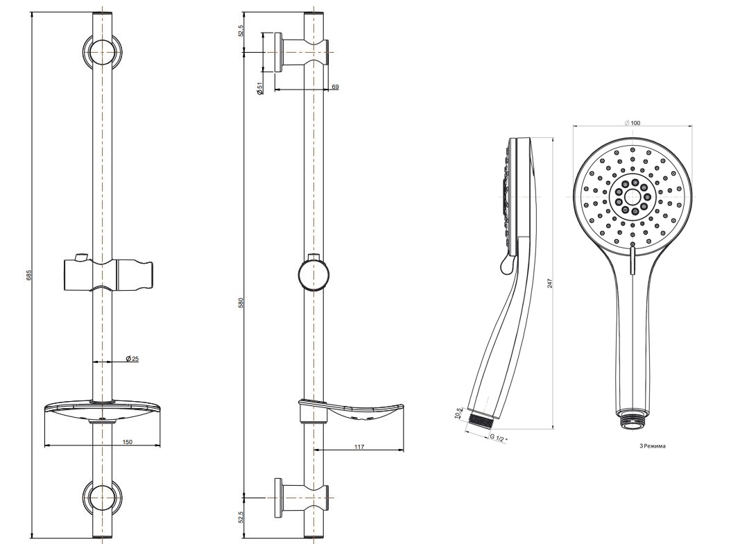 В комплект гарнитура входят хромированная штанга, полочка для мыла и держатель для гибкого душа.